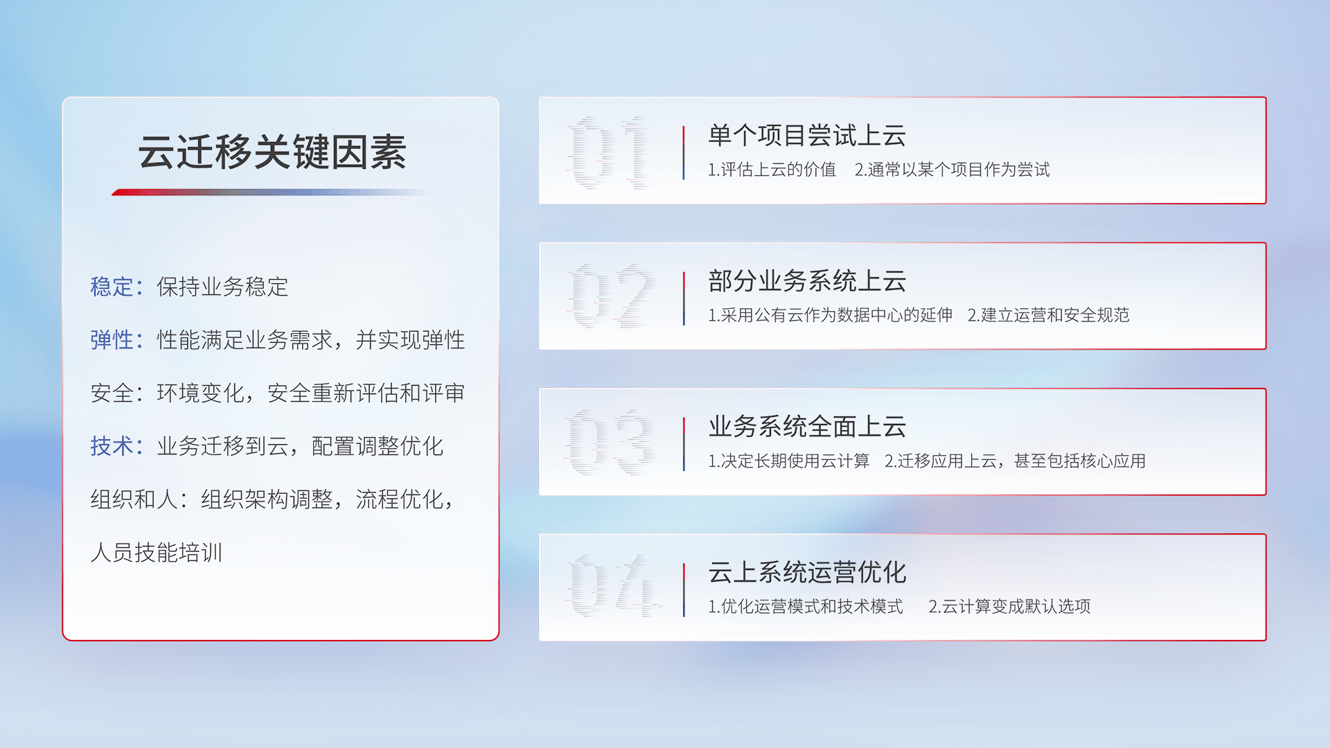 结合实际业务,,从规划设计、、云平台选型、、、、云原生改造、、、数据迁移、、集成交付,,,迁移全过程为客户识别最佳上云路径,,,做好风险识别管理,,设计网络架构、、身份权限、、安全审计合规、、、操作审计、、日志审计、、、、监控告警策略、、、多站点容灾设计等,,,,对云上基础设施进行整体规划,,,提升IT治理水平,,,,以满足弹性、、、高可用、、高性能的需求。。。