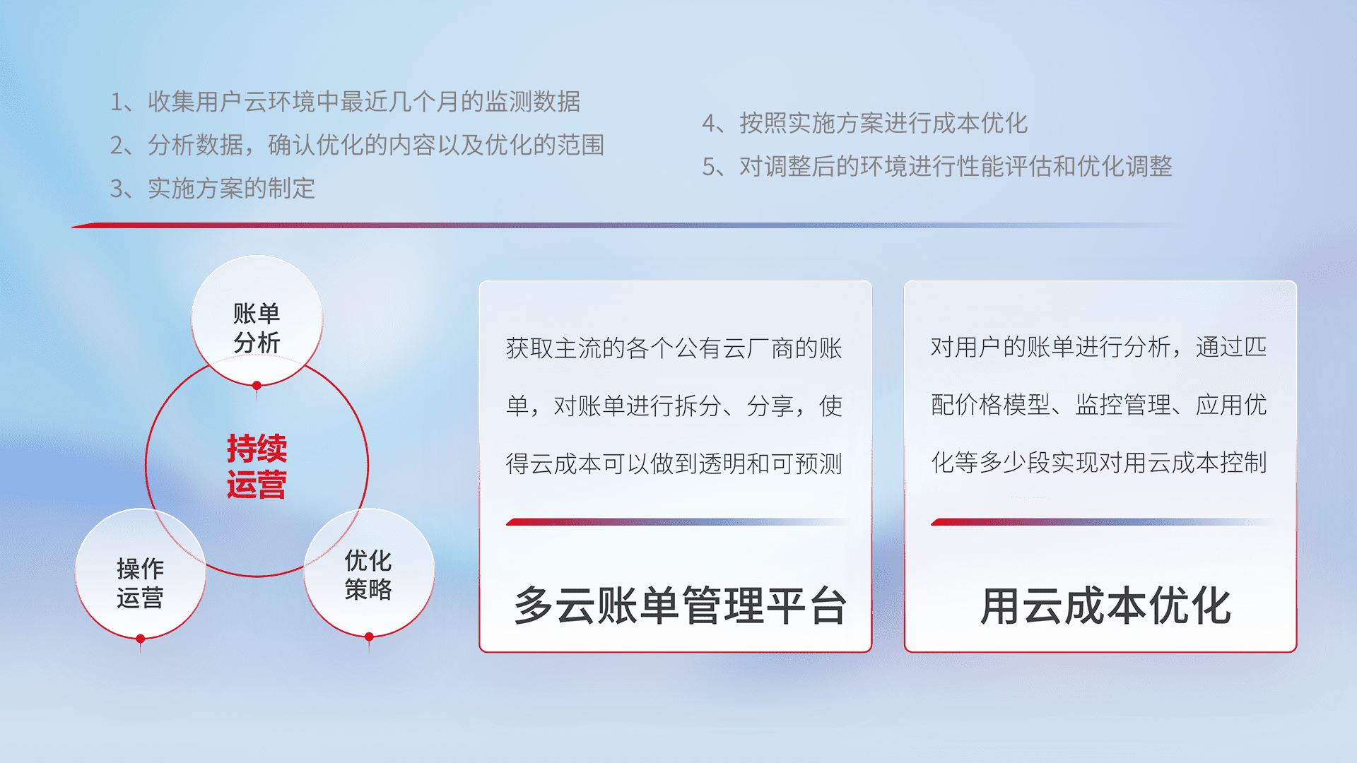 通过多云纳管,,,,以统一的资源数据模型把客户的云资源进行抽象和封装,,,,进而实现对多云资源的统一操作,,保障云资源管理的可靠性、、、、稳定性与可用性。。。。量身定制化运维内容,,,,配置、、、、开发运维、、、补丁管理、、备份、、、、监控、、认证和访问管理、、审计和日常巡检等,,,,保障在用云过程中的可靠度,,,,稳定度以及高可用率。。。。